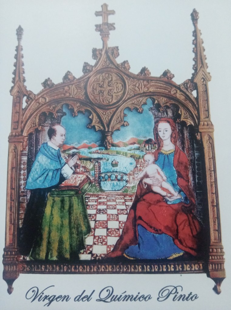 Y no es ésta, la que hemos comentado, la única Virgen en la familia. Bernardino Pinto tiene también una propia, la «del químico Pinto», en la que sale él ante la santísima, en un cuadro pintado por su esposa M.ª Luz Llona.