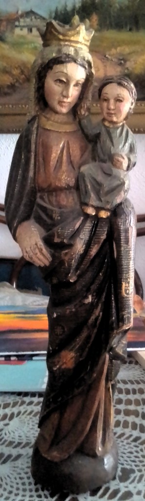 A parte de los regalos familiares que le hicieron, Bernardino trajo la talla de una virgen gótica, que es muy bonita, de un anticuario. Al dársela la «bautizó» como «la virgen de los Pinto», y así se ha quedado, ya como una tradición Pinto.