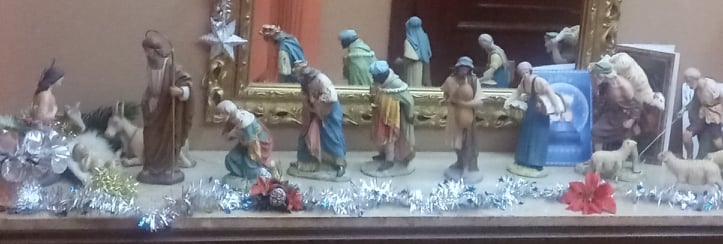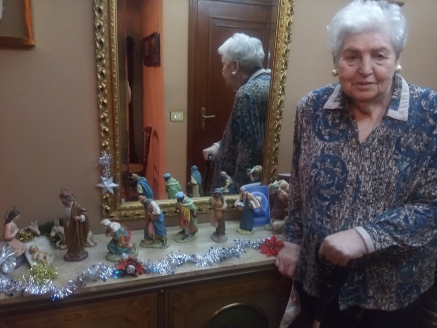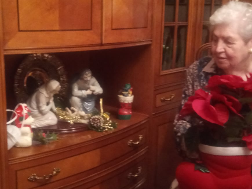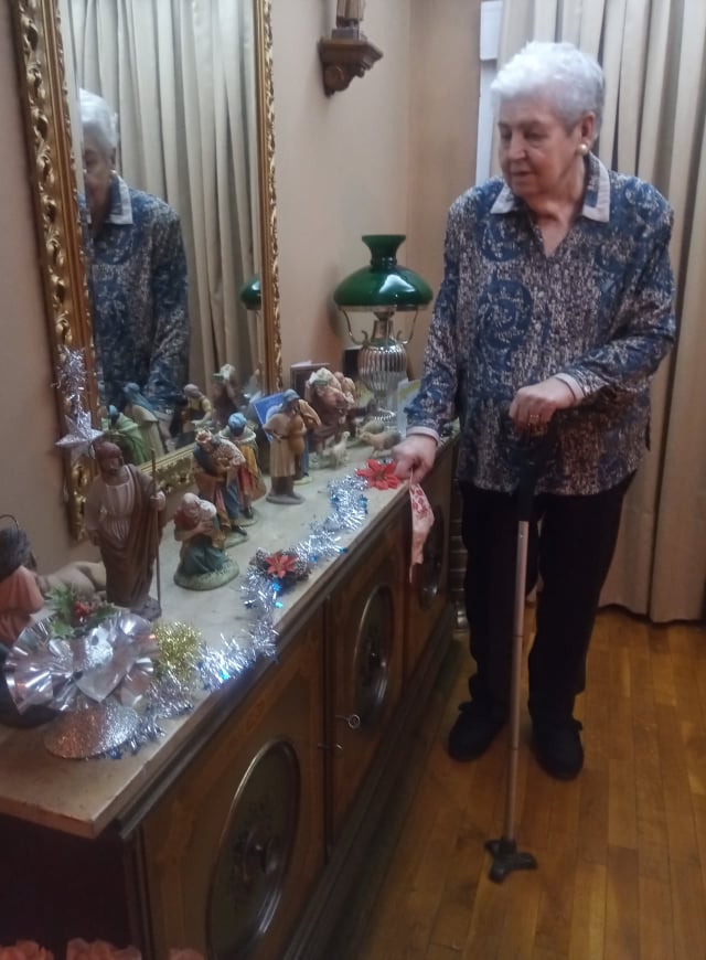 Familia Pinto Cañón, la abuela Lola con el belén y el Misterio. Madrid.
