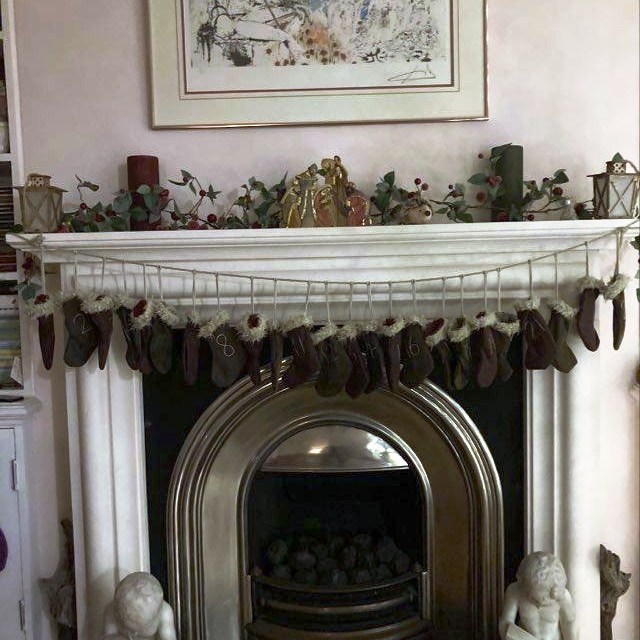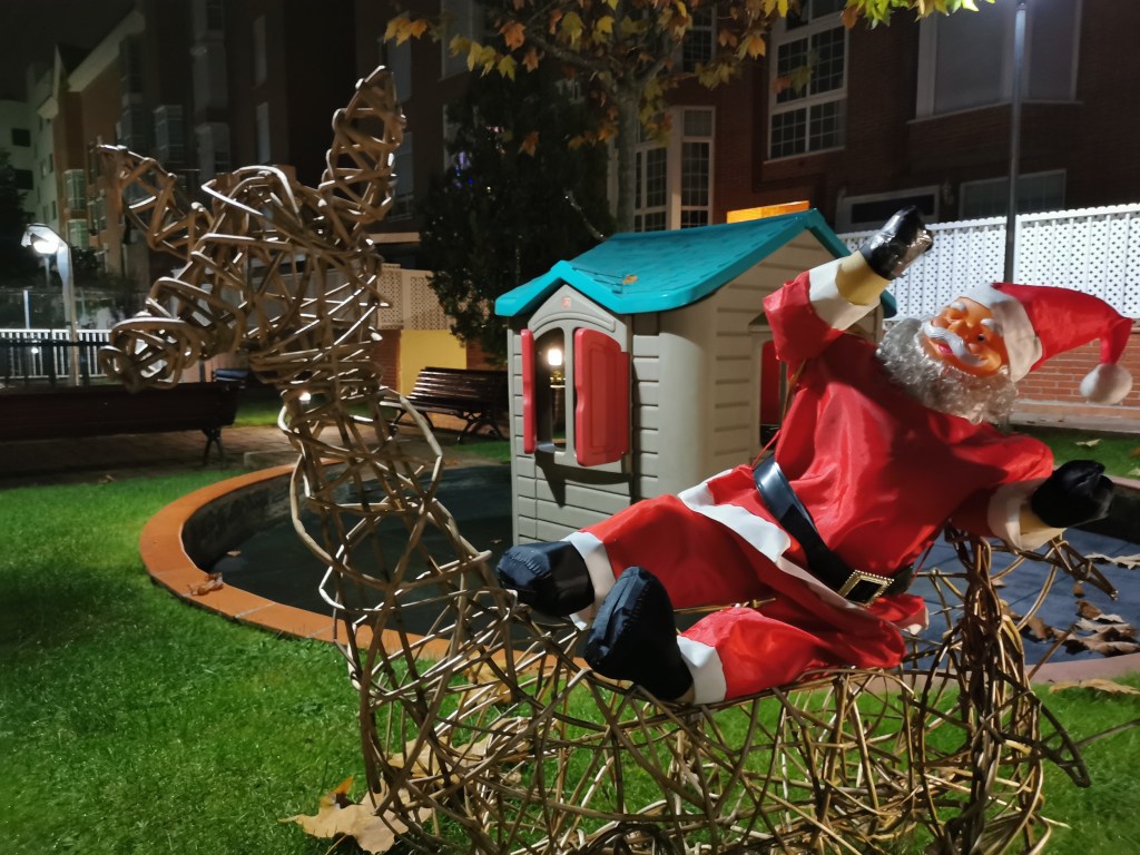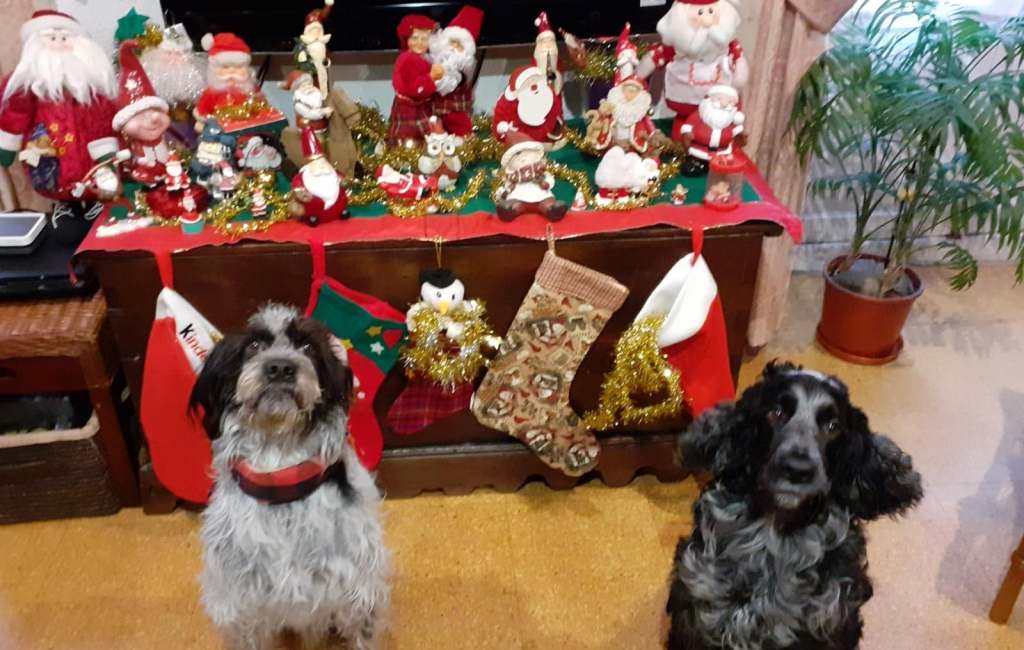 Trapo e Hilo, los perros de Rayo Pinto y de Sara Potxemuska. Con la colección de Papás Nöel y los calcetines de Santa Claus tras ellos. Desde León.