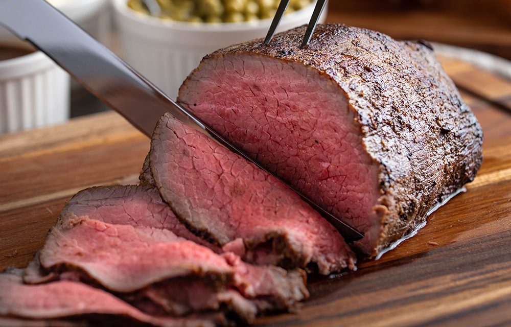 Receta de Roat Beef: Quemar la carne por toda partes, con salsa que se hace poniendo soja y un poco de miel en el aceite.