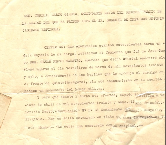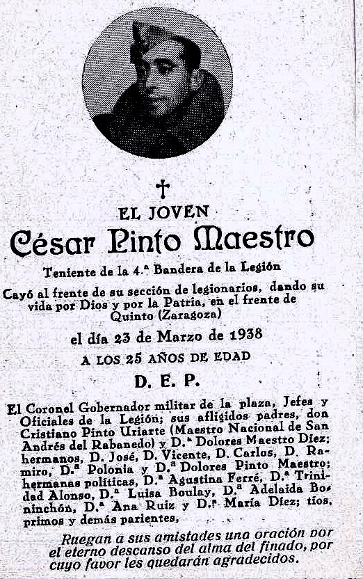 En una misa, que recogen los periódicos de la época, dedicada al Cuarto escuadrón de depósito de Caballos Sementales, en León, el capellán le citó: » La muerte de César Pinto Maestro ocurrió cuando ante la casa de los catalanes, y agarrado en la alambrada o parapeto fue herido en el pecho por una ráfaga de ametralladora, y al continuar avanzando sostenido por el heroico asistente Carreras, otra ráfaga les hirió a los dos en el vientre, a consecuencia de cuyas heridas ambos murieron«.