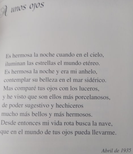 Versos románticos escritos con pulcritud poética, con un ritmo que trasmite el sentimiento que expresa, de un amor y enamoramiento distante, que se le escapa… Uno de ellos está dedicado a Maribel, «conocida con el nombre de Agarena«. Con el consentimiento de la tía Lola, hicimos un libro que se repartió para cada miembro de la familia, sus sobrinos y sobrinos nietos. También se llevó a algunas bibliotecas. Una de ellas la Publica de León. Se han leído poemas suyos en el Ágora de la Poesía (2013 – 2020)