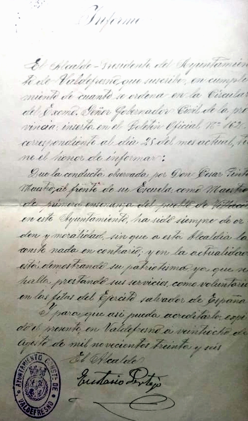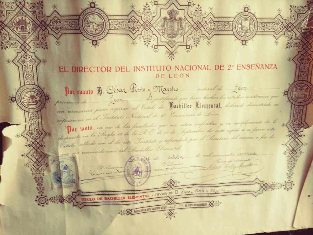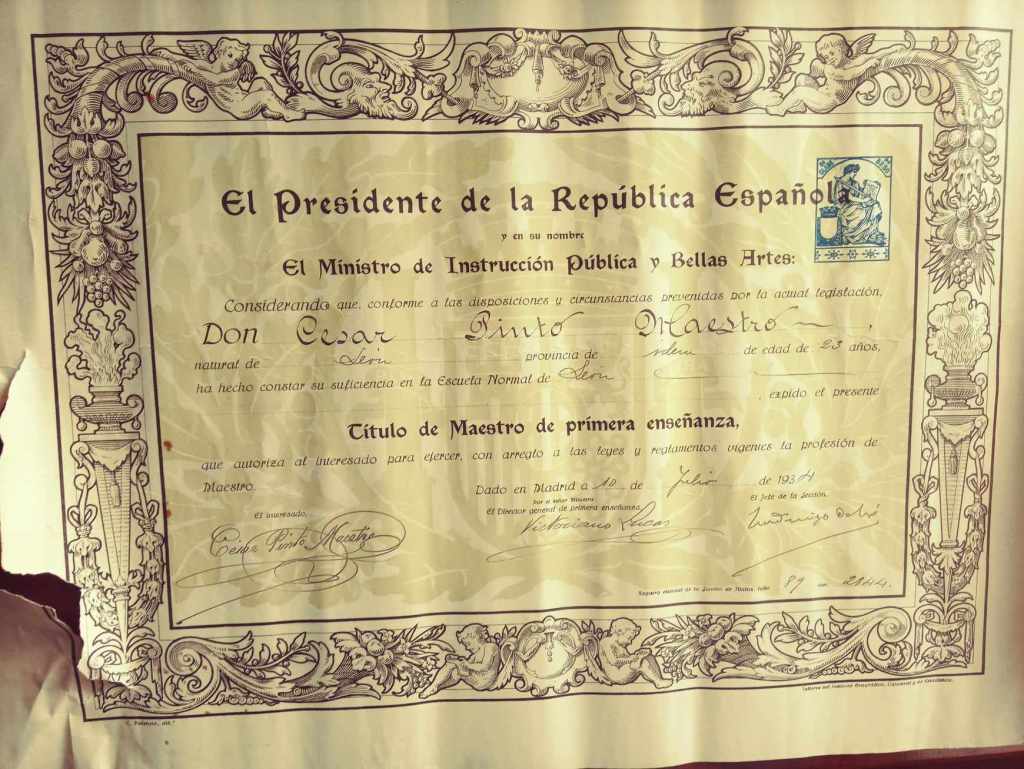 César: (León, 1913 – 1938) Maestro. De ideas progresistas y defensor de la república, vio ejecutar a una monja en la calle, según contó la tía Lola, y entonces se alistó en la Legión donde llegó a ser teniente. En el Boletín Oficial del Estado (BOE), 24 – I – 1937, aparece su nombramiento de Alférez provisional tras haber realizado un cursillo en la Escuela Militar.