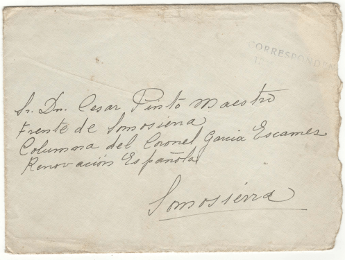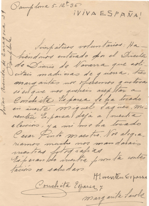 Carta que reciben los soldados que están en el frente con los nacionales, de «madrinas» de guerra. Mujeres que escribían a los soldados para darles ánimo. Divulgado por el Diario de Navarra, diciembre de 1936. Firma Conchita Esparza y de parte también de una amiga suya, Margarita Sarole. Escriben a César, que «les ha tocado.»
