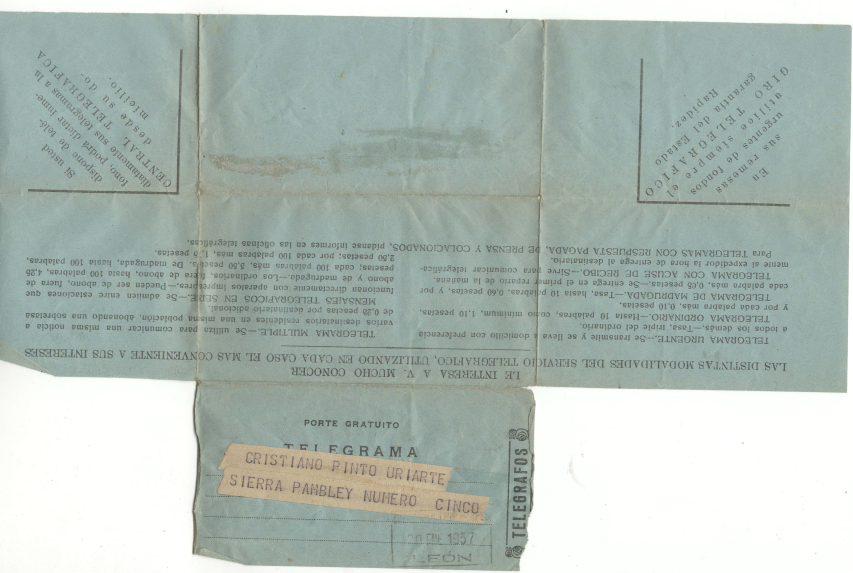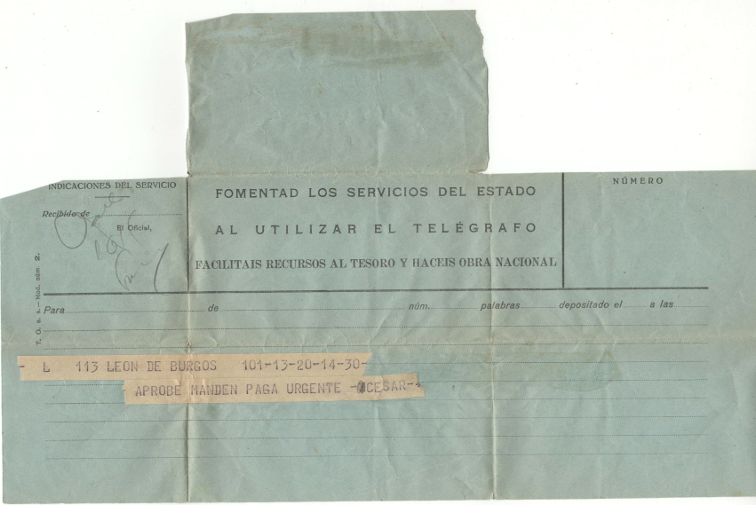 Telegrama que envía César a su padre desde Burgos para pedir dinero, después de haber aprobado algún curso, se supone que del ejército por el que ascendería de graduación.