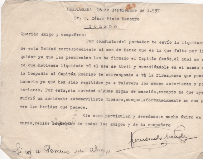 Le comunican el accidente automovilístico de un tal Diodoro. Parece ser que está haciendo un curso. Le escriben de Perdiguera, pueblo de Zaragoza, estando él en Toledo.