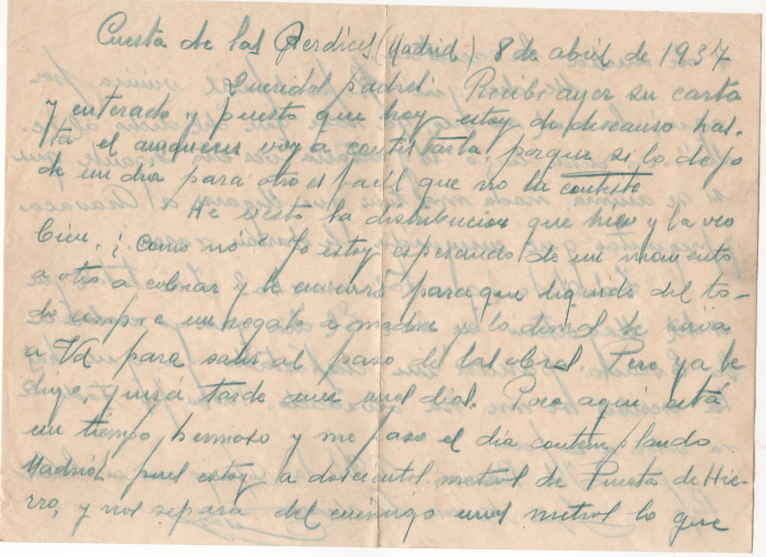 Desde la Cuesta de las Perdices, Madrid, Aravaca. Carta a sus padres. Muestra su alegría de haber recibido carta de ellos. Va a cobrar y pide que compren algo a su madre, Dolores Maestro. Dice estar cerca de Madrid, con vistas muy hermosas. Pregunta por su hermana Lola, la pequeña y pregunta que cómo le va con su labor de magisterio. Él piensa que cuando vuelva no va a saber ni escribir, pero todo es comenzar de nuevo.