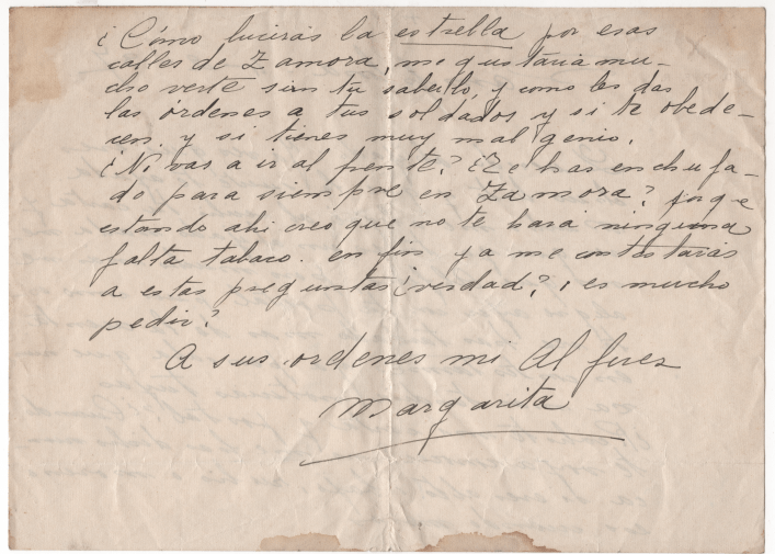 Le pregunta que cómo es, físicamente. Alaba que sea alférez. Le gustaría verle sin que él lo supiera y cómo da las las órdenes a los soldados. También si va al frente