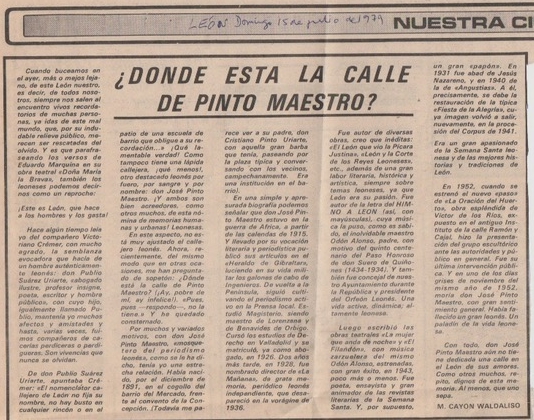 El periodista y cronista de la ciudad de León, Waldaliso Cayón, el año 1978 pidió públicamente una calle para José Pinto, le llama “mosquetero del periodismo leonés”. Años después una calle lleva su nombre, frente a la antigua azucarera, hoy Palacio de Congresos.