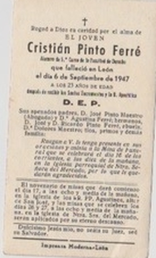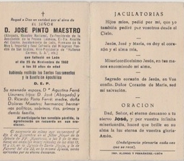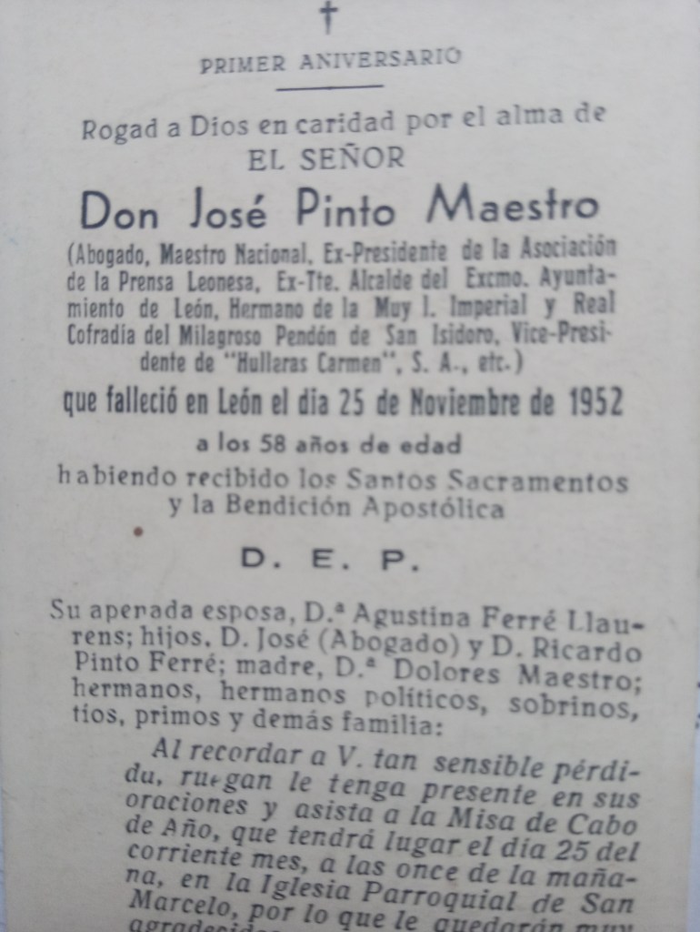 José Tomás Pinto Maestro, el tío Pepe, Pepe, don José Pinto. (León, 1893 – 1952) Así fue nombrado en sus diversos aspectos de la vida. Es el único de sus hermanos que se bautizó en la iglesia de Santa Marina. Los demás, todos ellos y a muchos de la generación posterior, se les dio este sacramento en la Iglesia del Mercado. Fue la suya una vida trágica marcada por la muerte de dos hermanos y dos hijos, a la vez que expresó y contagió entusiasmo por su gran pasión de vida: León. Podemos ver reflejada su manera de ser tal como retrata a los leoneses la novela “La Pícara Justina”: “Moridos de amor por su tierra”. Así lo definía su hermana pequeña, la tía Lola, de quien he sacado gran parte de esto que cuento. Una persona con grandes inquietudes, con una historia personal, que narraremos, en parte de lo que él contó a sus allegados, que he recibido de su hermana Dolores, la tía Lola y referencias que perviven en noticias de prensa, al convertirse en un personaje de León. Inculcó a su familia la importancia del apellido Pinto.