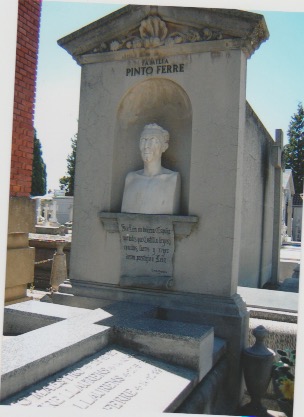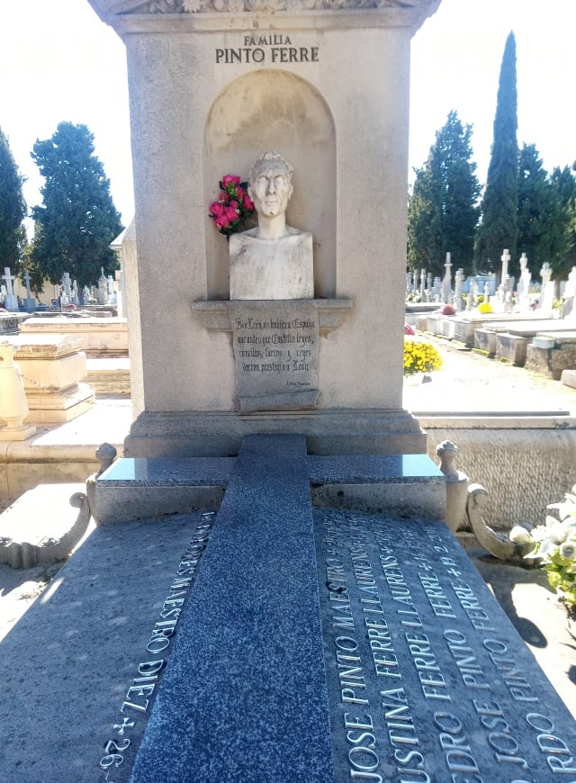 (Tumba de la familia Pinto Ferré, con el busto de José Pinto y unas letras del himno de León.)