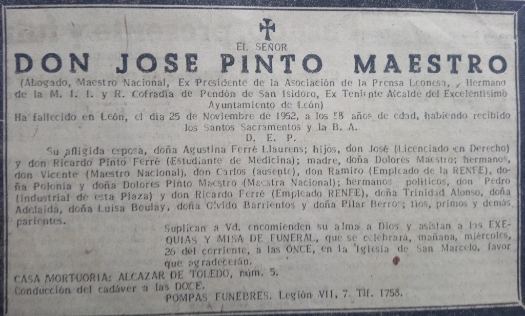 Algo que no supo la familia, o al menos nada se dijo es algo que se encontró en los archivos que rescató la asociación de la Memoria Histórica: Su expediente en el Tribunal Especial para la Represión de la Masonería y el Comunismo | Descripción: Ficha de encausado de José Pinto Maestro | Fecha: 1940 | Referencia: TERMC, Fichero 74, Documento 2414175. Fichero de la Sección Político-Social | Fichero 52, Ficha P0126530. Tribunal Especial para la Represión de la Masonería y el Comunismo | Descripción: Expediente personal de José Pinto Maestro. | Fecha: 1948-06-28 | Referencia: Sección Especial de Masonería B, Caja 328, Expediente 14 José Pinto vivió en una casa ilustre en la calle Alcázar de Toledo – León. Pienso que fue investigado, de ahí los documentos, pero en ningún caso juzgado ni represaliado. Quizá fuera sospechoso porque su hermano Julián fue condenado a la pena de muerte y le fusilaron el 16 de agosto de 1936, recién iniciado el golpe de Estado.