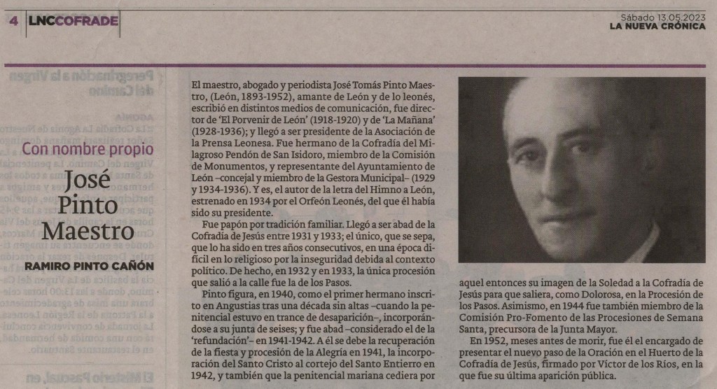 El año 1999 en la revista “Transeúntes”, don Ramiro Ramos, abad del Dulce Nombre el año 1946 declara: “Inolvidable José Pinto, cultísimo y temperamental, gran leonés del barrio del Mercado; Su ley de oro es que mataba por las cofradías”. Cuenta que al salir el año 1931 la procesión del Dulce Nombre, le dijeron que a ver si era tan cojonudo y sacaba también a la de Minerva y Vera Cruz. Sus responsables la sacaron a la calle, sin que tocase salir y sin “protección”, lo que provocó una algarada, con incidentes tales al ponerse a cantar un grupo cerca de la plaza de santo Domingo, que hubo que sacar las horquetas. Un tal señor Espinosa resultó con una costilla rota.