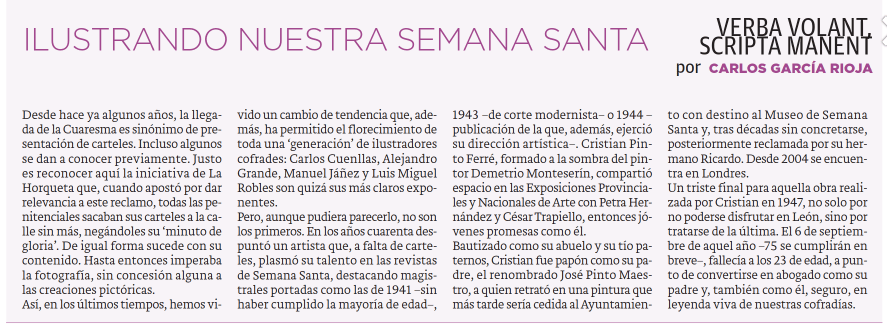Pepe Pinto fue director del periódico bisemanal “El Porvenir de León”, fundado el año 1883, desde 1918 hasta que se cerró dos años después. Dirigió la revista “Guante blanco”, en la que empezó siendo colaborador. Redactor del semanal científico literario y católico “La Crónica de León” (1922 – 1930) También en “El defensor de León” (1916 – 1926) bajo el pseudónimo de Cyrano de Bergerad. Director del periódico “La Mañana” (1936 – 1939), fundado en 1928. Dejó de editarse once años después. Escribió junto a Lamparilla, Francisco Pérez Herrero y Antonio González de Lama, entre otros. Autor de artículos en “León de España”. También tuvo el cargo de presidente de la Asociación de Prensa Leonesa (1936). Mi tía Lola admiró a su hermano mayor, pero de los periodistas dijo: «Para que un periodista vaya al cielo, pluma y tintero habrán que bailar en sus manos«, a lo que añadía, «que me perdone mi hermano Pepe».