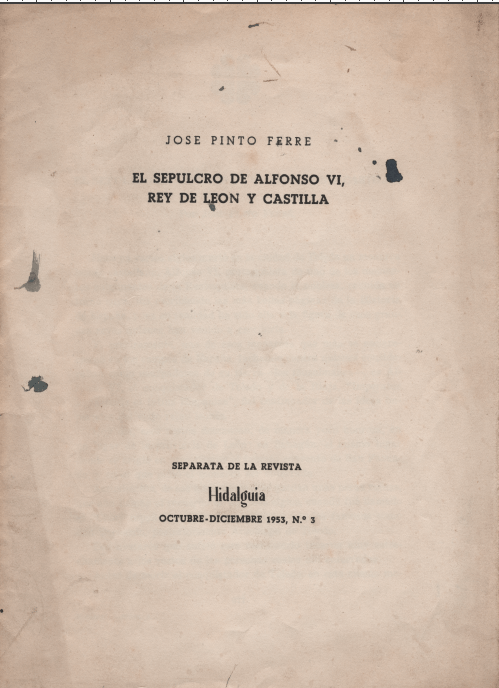 Facsímil, año 1953, en el que alega una sepultura digna para el rey Alfonso VI, enterrado en Sahagún. La propuesta de José Pinto, siguiendo la estela de su padre que insistió en ella como abogado y así lo refiere, es que sus restos sean llevados al mausoleo de san Isidoro, junto a los demás reyes de León. Lo cual no se ha conseguido, sí hacerle una sepultura a él y a sus esposas e hijos, en el monasterio de Santa Cruz, Sahagún – León. Entre otras razones porque las monjas benedictinas, encargadas de custodiar la sepultura no quisieron el traslado para respetar la voluntad del rey que quiso