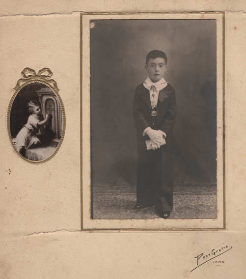 El día de su primera comunión, con una foto del famosos Pepe Gracia.