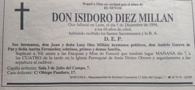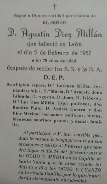 Agustín Díez Millán (padre): Vivió en El Egido, actualmente un barrio de León, que anteriormente fue un pueblo. Nadie conoció a familiares suyos, ni padres, hermanos, ni primos. Su hija pequeña piensa que fue hospiciano. De hecho su hija pequeña y nietas dicen que sus apellidos son Díez Millán, y en el papel oficial en el que aparece es con los indicados. Es decir el de sus hijos. No cabe duda, porque en el BOE del 24 de abril de 1944 el juzgado de 1ª Instancia abre un expediente de unas obras en el término de León, donde la parroquia antigua de San Pedro de las Huertas, para dar aviso a los dueños de las fincas colindantes para hacer alegaciones en el plazo pertinente si les perjudicaba las obras cuyo contratista era Agustín Díez Millán, casado. Su hijo Agustín, con los mismos apellidos fue soltero.