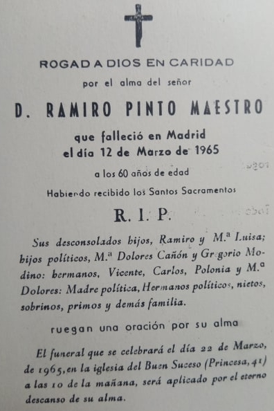 A la semana murió mi abuelo Ramiro de pena. No quiso comer, ni hacer nada. Le atendió un colega de mi padre que era psiquiatra, Pelaez. Luego nos atendería a mí y a dos hermanos más. Murió de pena, se lamentaba la tia Lola. Contaba también que ella no habían desecho las maletas de volver de Madrid, cuando recibió la noticia del fallecimiento de su hermano. Ambos fueron enterrados en el cementerio de La Almudena. Fueron dos los hermanos de la tía Lola que padecieron la misma causa mortal. Y añadía: «dicen que el corazón no duele pero sí, más que cualquier otro dolor».
