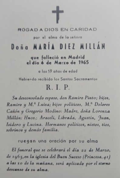 Consta en el BOE del 28 de enero de 1943 que tiene derecho a una pensión por la muerte de su hijo Martín Díez Millán en la Guerra Civil, perteneciente al Cuerpo de San Fernando. Otro hijo, Lucio, murió en el bando republicano sin que por éste recibieran nada.
