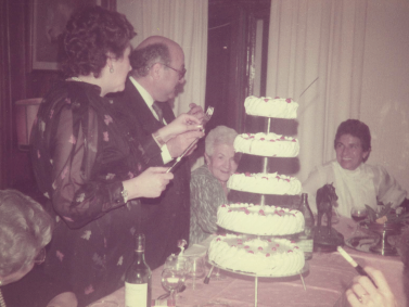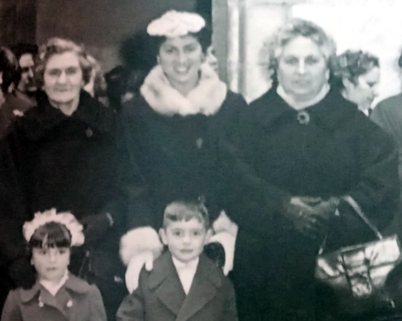 Araceli en las bodas de plata de su ahijado Ramiro y Lolita. A su lado su hermana pequeña, Lucy. Y en la comunión de su sobrino nieto, César Pinto. A su izquierda Lucy y a la derecha su marido Andrés Guerra.