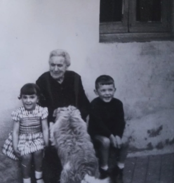 (La abuela Lorenza, con Belén y con Andresín, y el perro «Barbas», sentados en el poyo -banco de piedra- en la casa de El Egido. En la playa con una pala y a su izquierda el bisnieto Andresín.)