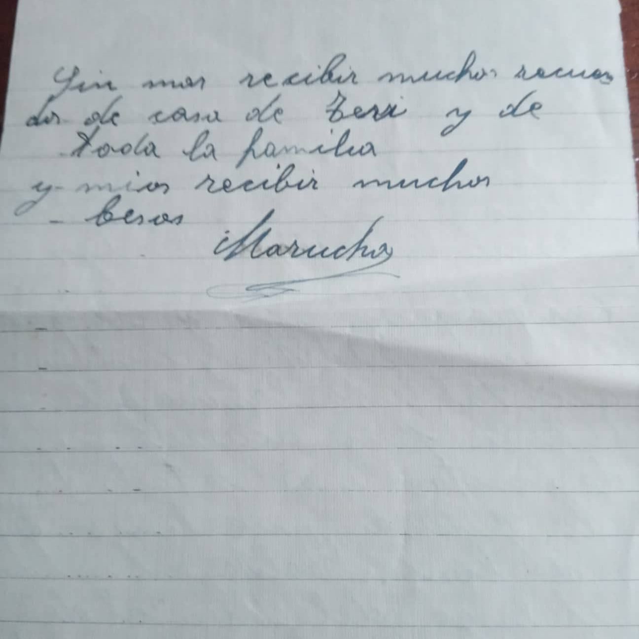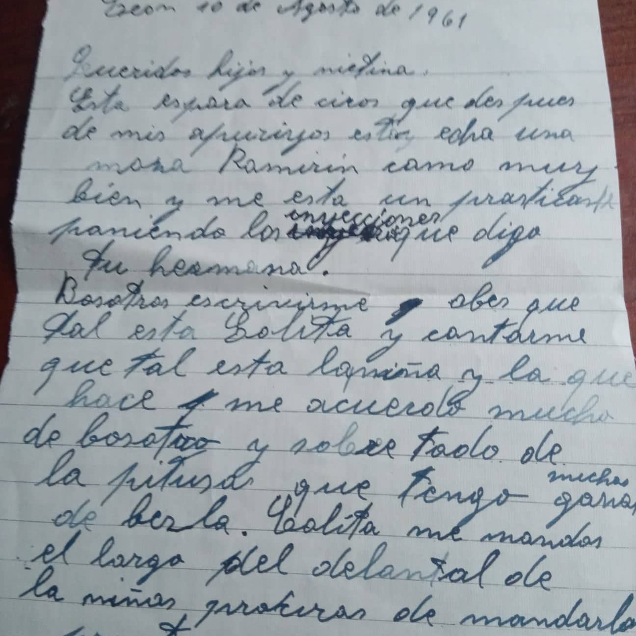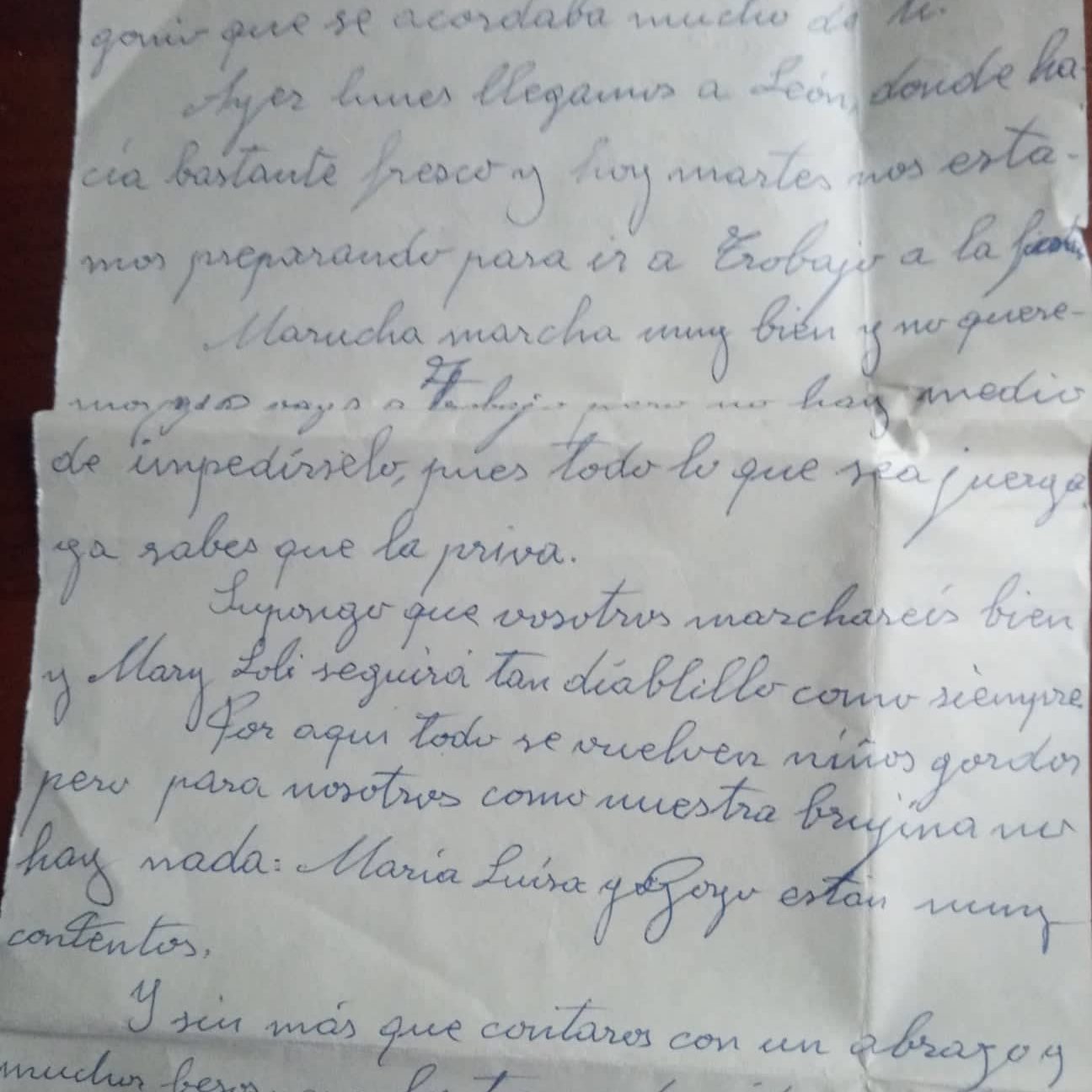 Cartas de Ramiro y Marucha, que escriben a su hijo (tocayo) y preguntan por la «diablillo», su nieta Loly. Dos letras muy diferentes la de cada uno. Marucha escribe encima de la de Ramiro al comienzo, para dar recuerdos. Sobre su estancia en Fresno de la Vega, de donde era el señor Miguel, al que conoció en la cárcel de San Marcos. Poco más de un mes nacería el nieto Miry, también tocayo, por eso preguntan por Lolita. Curiosidades de familia y de la época.