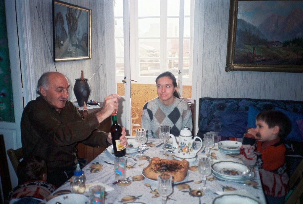 En la casa de Yolanda y Ramiro de la calle Mariano D. Berrueta, descorchando una botella de vino bajo la atenta mirada de Elena Pulido y frente a Rayo. Año 1999.