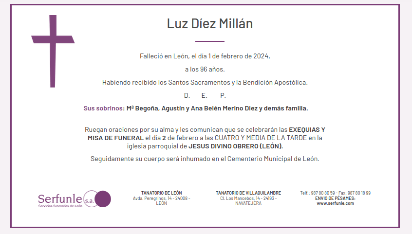 * Luz, Lucy. (León, 4 – VI – 1927 / 1 – II – 2024) Siempre resalta que su nombre es Luz, sin el nombre de «María» delante. La llaman sus amigas y familia «Lucy». Muy juvenil y deportista. Ha hecho muchas excursiones a la montaña y ha esquiado hasta los ochenta años. Ha aparentando mucha menos edad de la que tiene. Al llegar a los noventas y andar de médicos, se lo decían y a ella le hacía gracia. Ha hecho largos viajes en coche con las amigas, que fueron su segunda familia. Una mujer muy independiente.
