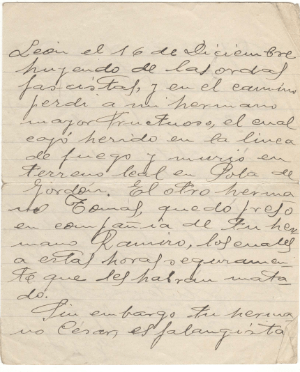 El 7 de abril de 1937 Vicente Pinto, recibe la carta de un camarada en la que informa que un hermano de quien escribe, Tomás López, ha sido hecho prisionero