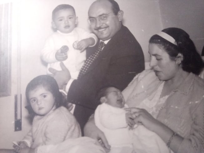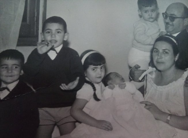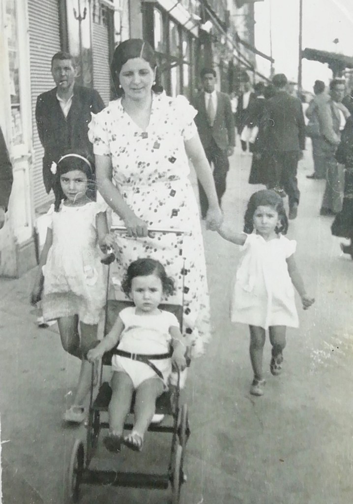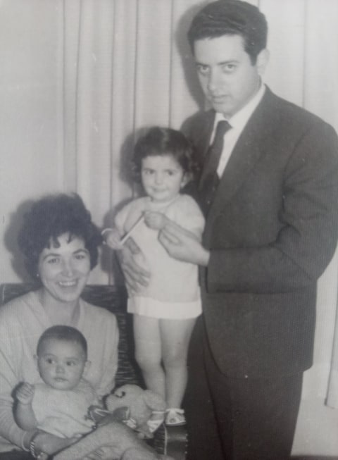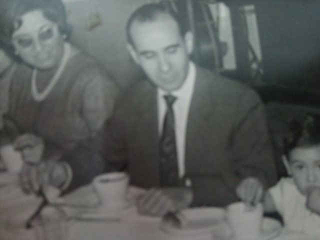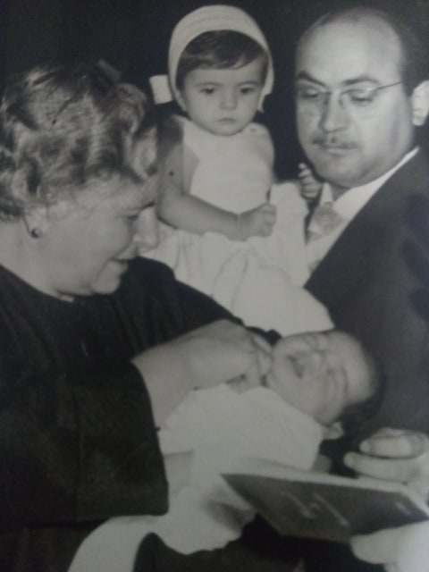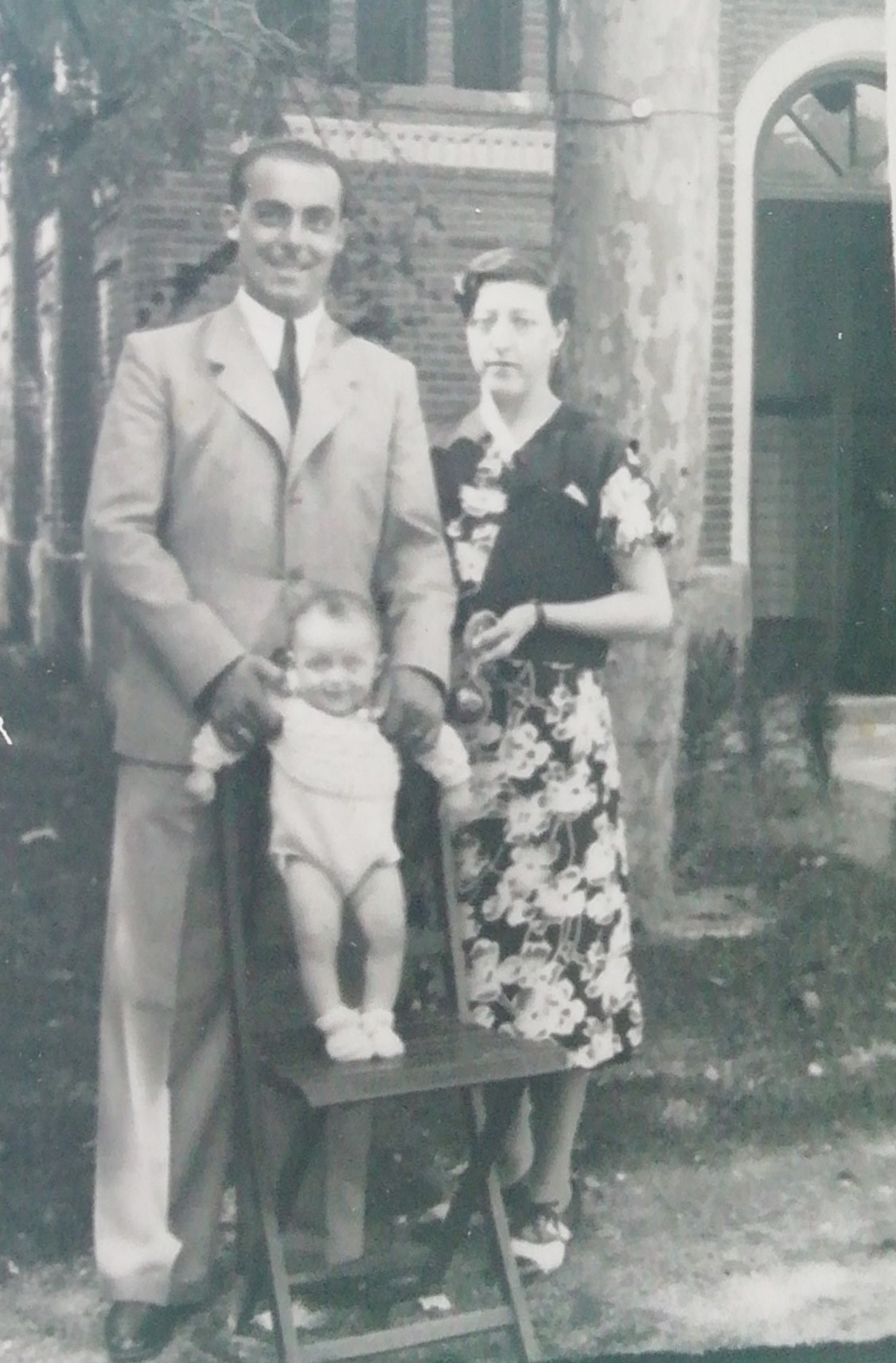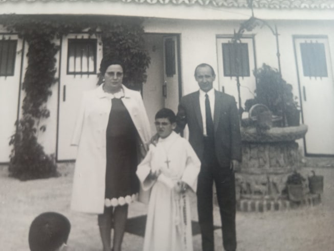 Loly asomándose para no perderse nada, nuestro padre al lado y mamá, Lola Cañón. Detrás de Jose se ve asomarse a Estrellita.