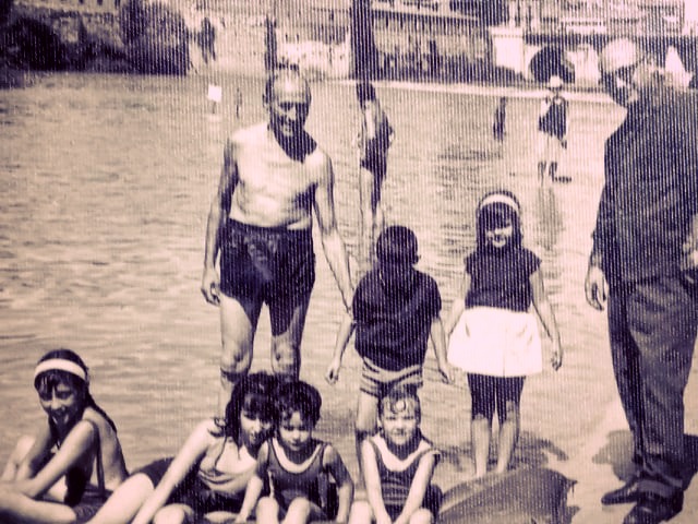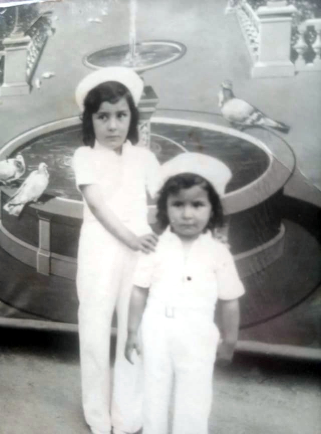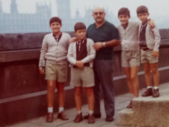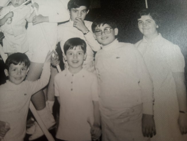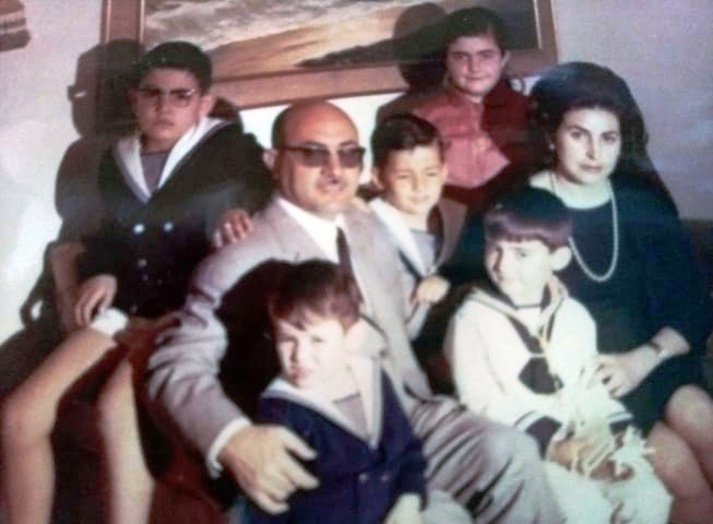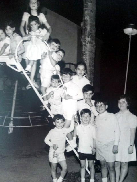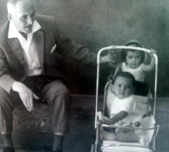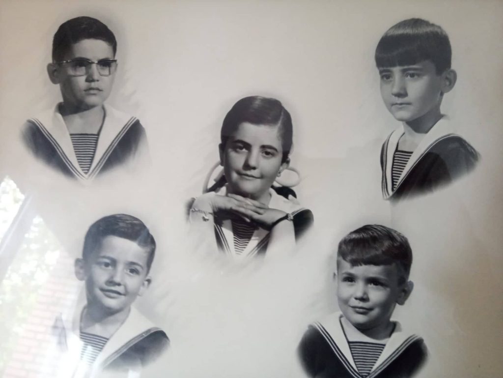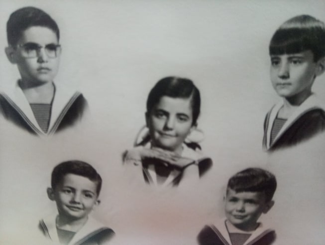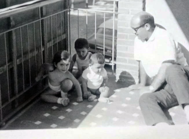 Antes de salir de casa, para ir al colegio, al que nos llevaba en coche, o para alguna reunión familiar mi padre nos peinada, sujetándonos la cara. A César con el pelo a un lado, a Gaby con flequillo y a Jose y a mí con lo que él llamaba, según se decía en su juventud, con el «arriba españa«, una especie de tupé que nos hacia meticulosamente.