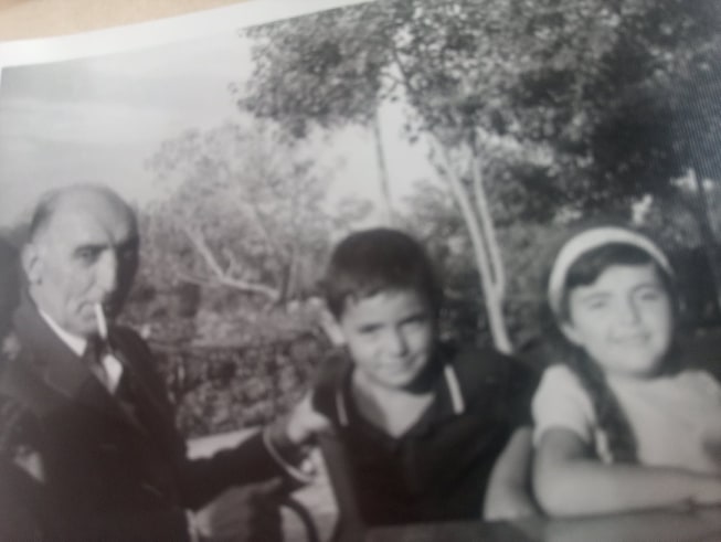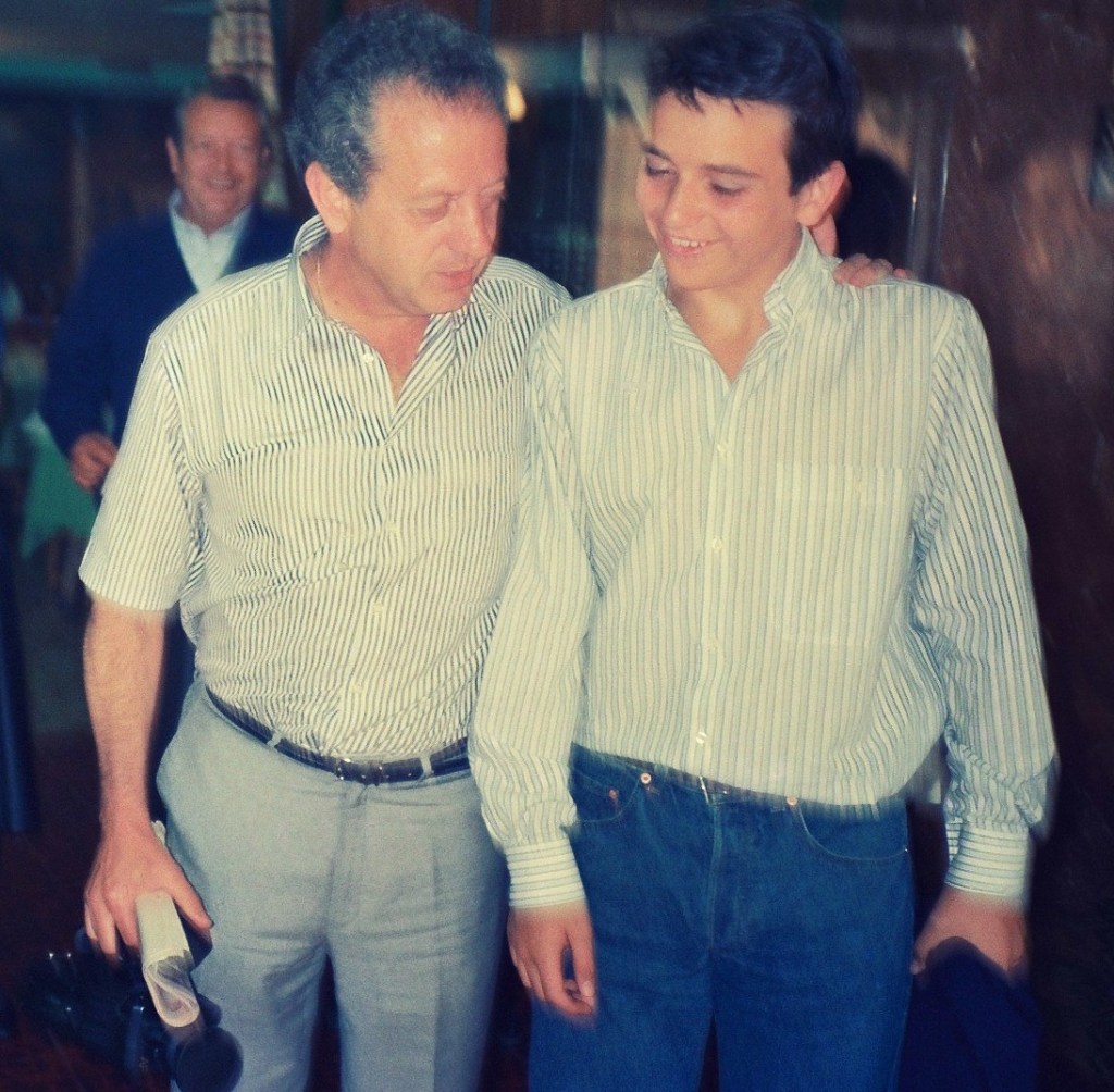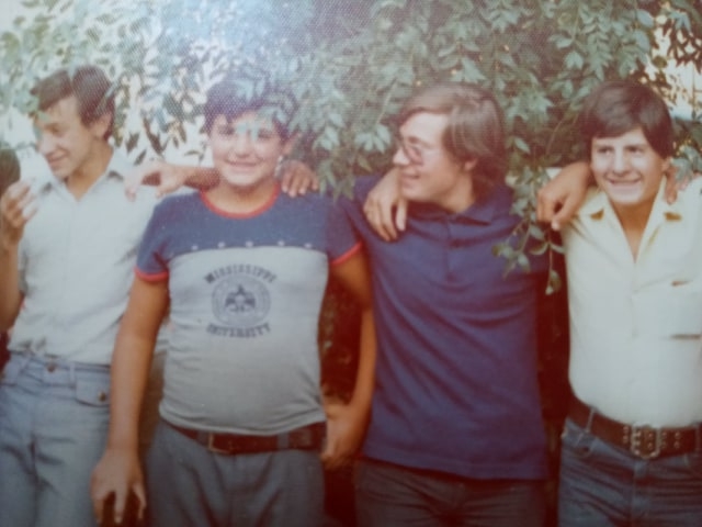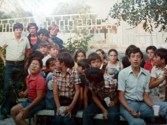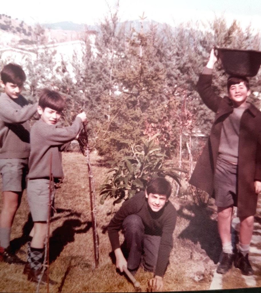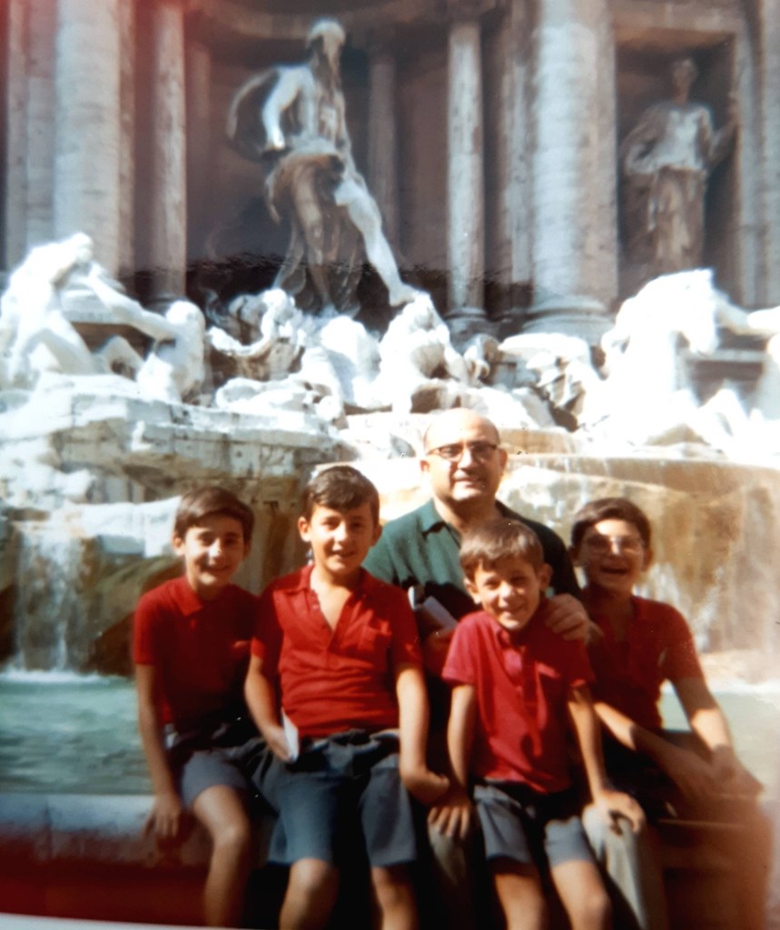 Antes de salir de casa, para ir al colegio, al que nos llevaba en coche, o para alguna reunión familiar mi padre nos peinada, sujetándonos la cara. A César con el pelo a un lado, a Gaby con flequillo y a Jose y a mí con lo que él llamaba, según se decía en su juventud, con el «arriba españa«, una especie de tupé que nos hacia meticulosamente.