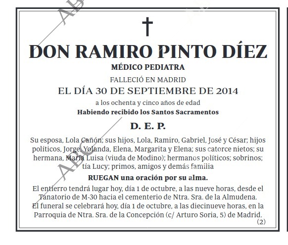 Ramiro Pinto Díez, Ramirín, el doctor Pinto. (León, 19 – XII – 1928 / Madrid 30 – IX – 2014) Hijo de Ramiro, padre de Ramiro y abuelo de Ramiro. Lo que llevó con orgullo: Prolongar en la familia su nombre, que él continuó de su progenitor.