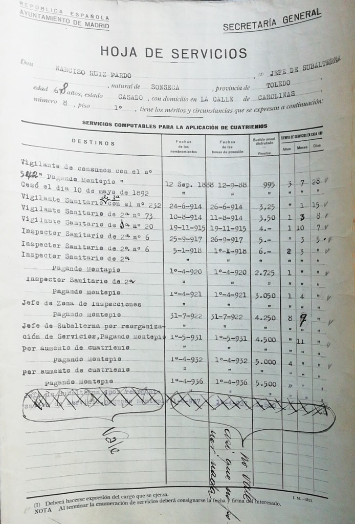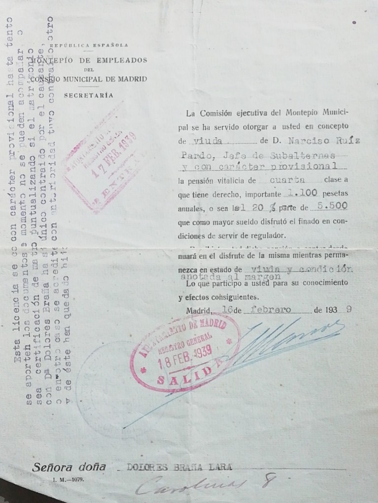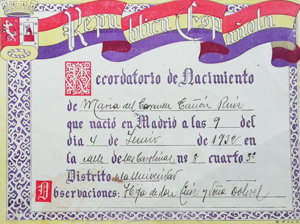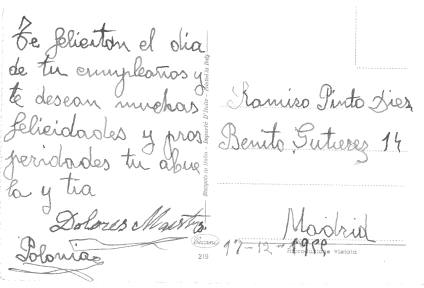 Con dos hijos, mis padres se trasladaron a vivir a la calle de Alcalá, 383, metro Pueblo Nuevo. Donde han vivido hasta el final de sus días. El piso se quedaba pequeño y al cabo de unos años compraron el de al lado y los unieron, segundo E y F. En éste estaba el despacho de mi padre, el recibidor, un baño, el salón y el dormitorio de mis padres y al lado el de Loly. En la otra parte la cocina, una despensita en el pasillo, otro cuarto de baño más pequeño, el cuarto de la plancha, el comedor y dos dormitorios, el de los dos mayores y el de los dos pequeños. Antes antes, dormíamos en uno los cuatro, dos en cada cama. El de los mayores, cuando ya cada uno dormía en su cama, fue la salita de estar. Mi madre daba mucha importancia a los visillos, porque un medio novio que tuvo cuando le acompañó de joven hasta casa, se fijó que no tenía visillos. Y eso se le quedó grabado. No fue novio, pues no fijaron una fecha de boda, sino como ella decía un pretendiente que le regalaba flores y que le escribía. Su nombre es Pablo España de la Torre (7 – VI – 1920) Por una esquela en el periódico ABC ella supo que murió, en octubre de 1992. Fue catedrático de Literatura. Impartió clases en el Instituto Lope de Vega, pero fundó un colegio en la casa donde sus padres tuvieron una vaquería, en la calle Fernández de los Ríos 52. Se llamó el colegio «España santa Eulalia». «España» por su padre y «Eulalia» es el nombre de su madre. Regaló un cuento de Mari Pepa a la hermana pequeña de Lola. Y otro que aún recuerda: «Riquete el del Copete». Un cuento de valores.