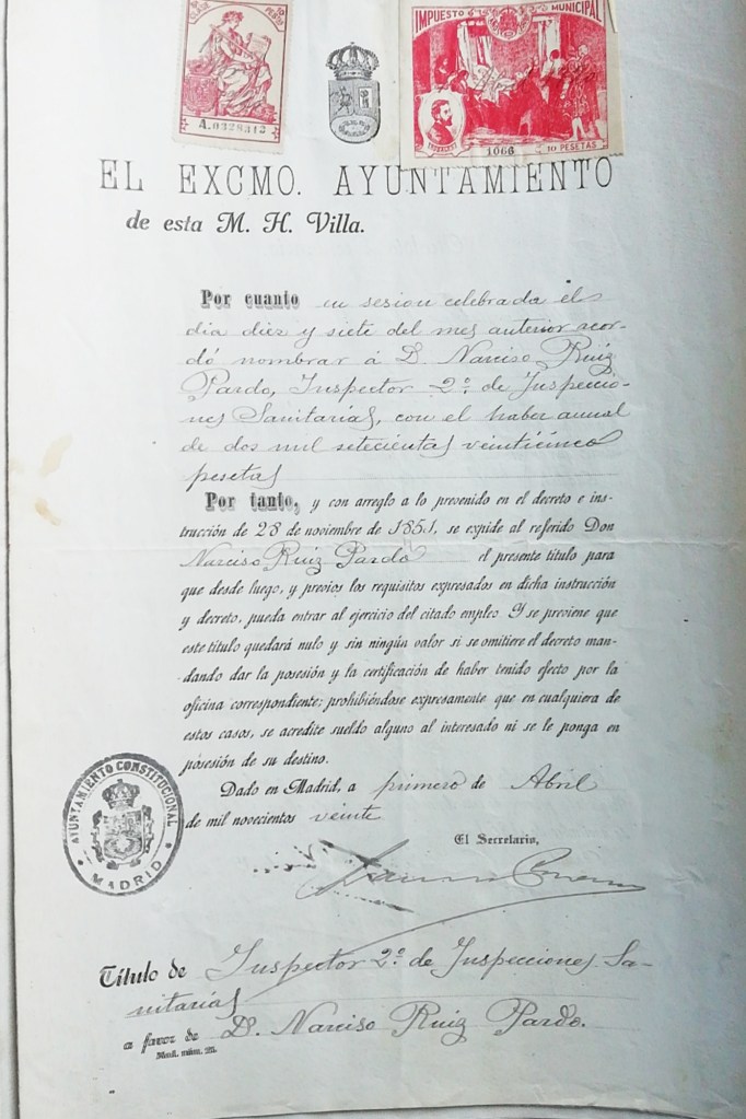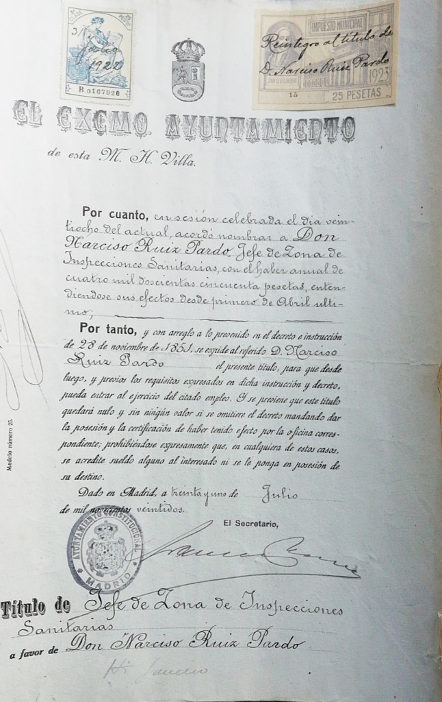 Fue médico del seguro. Y tenía una consulta privada junto con Gabriel Gómez Lobo, un gran amigo. La consulta del Seguro la pasó por las tardes, primero en el ambulatorio de Puerta de Toledo, hoy Centro de Salud. Luego en el de Marqués de Badillo. Muy pocas veces fue en coche, pues el metro le llevaba desde Pueblo Nuevo, cuya entrada (boca de metro) estaba a unos pasos de su casa, directamente, sin hacer trasbordo. Aprovecha ese tiempo, cerca de una hora para echarse una sistecilla. Los fines de semana se la echaba a pierna suelta. A veces de pequeño yo con él y me gustaba poner la mano en su barrigota y sentir como subía y bajaba. Y se le oía la respiración muy fuerte, sin llegar a roncar.