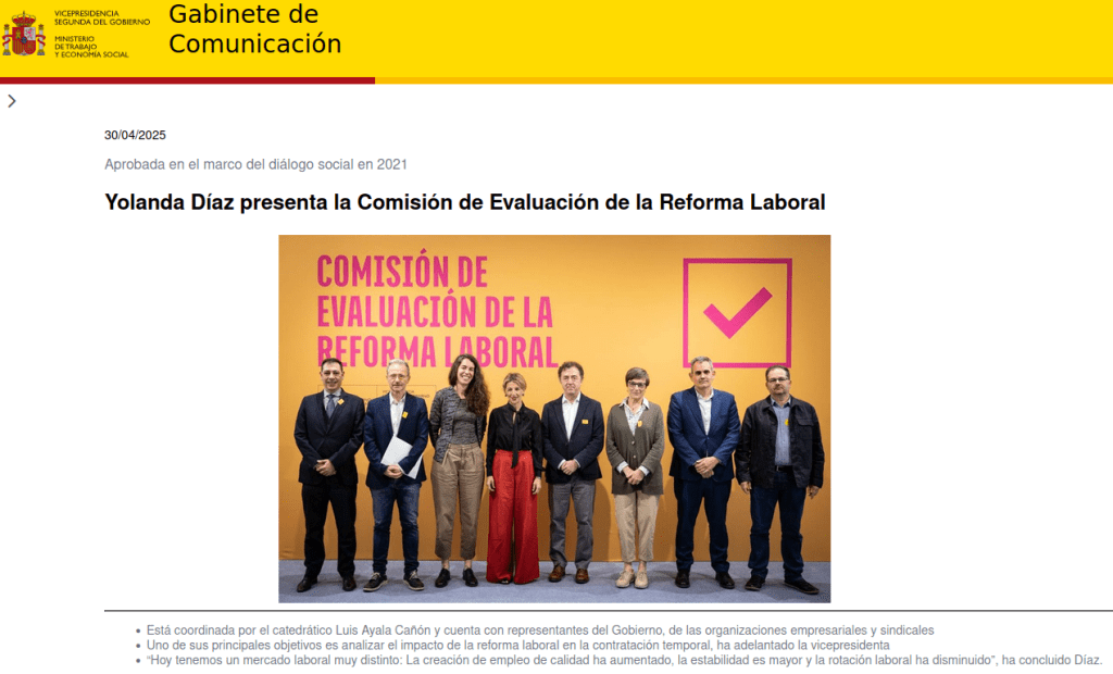 La vicepresidenta segunda y ministra de Trabajo y Economía Social, Yalanda Díaz, ha presentado hoy en Madrid la Comisión de evaluación de la Reforma Laboral aprobada en 20201. El coordinador del grupo de expertos es Luis Ayala Cañón (Catedrático de la Universidad Complutense de Madrid.) Año 2025. Luis es el quinto por la izquierda.