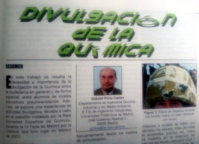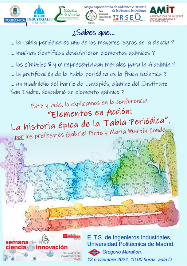 «La historia épica de la tabla periódica», en la E.T.S. de Ingenieros Industriales de la Universidad Politécnica de Madrid. Paseo de ciencia y cultura por Madrid (delante del Ministerio de Agricultura, en Atocha), en el que reivindica a cuatro Españoles que descubrieron tres elementos químicos, Wolframio, Vanadio y Platino. Llevando la cultura de la química a las calles y en las aulas.