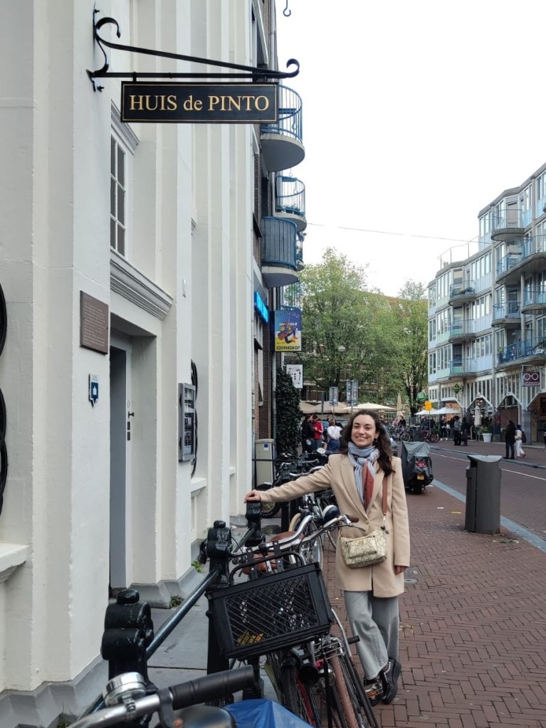 En Ámsterdam, participando en un congreso de medicina. Coincidió con su prima Daira Pinto. Orgullosa ante la Casa de Pinto, de familia judía y portuguesa.